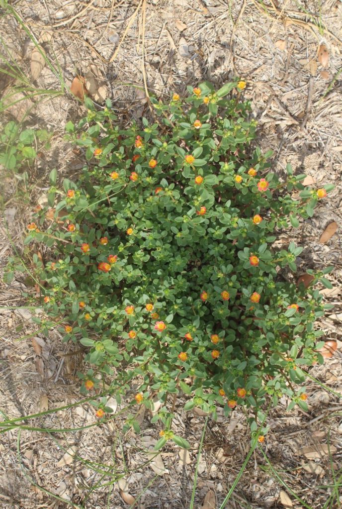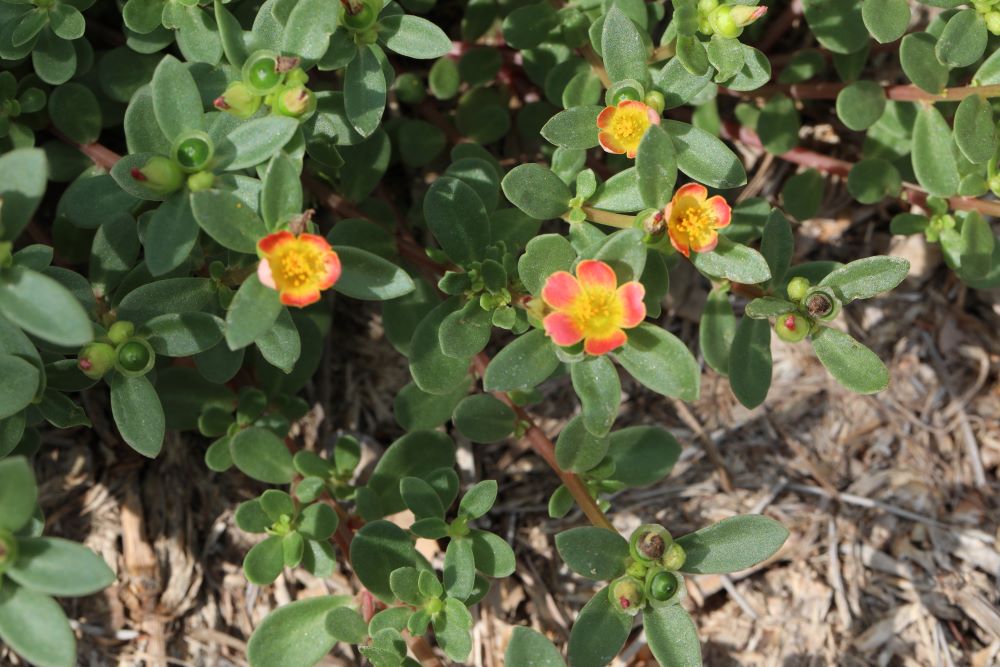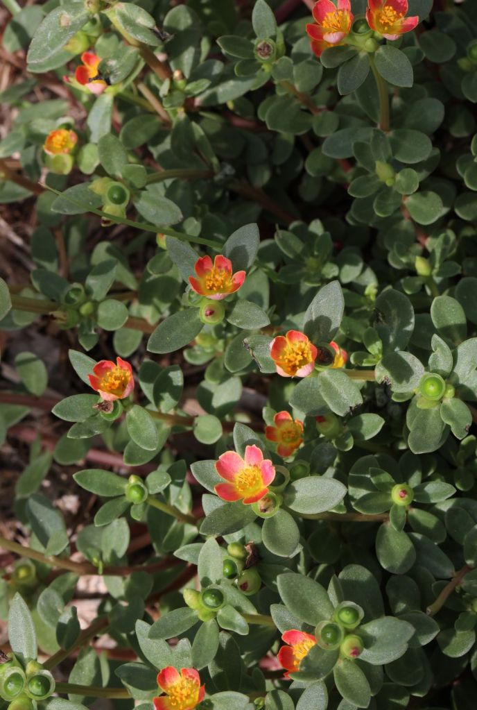 Field Identification: Succulent leave structure, slight pink to stems, flowers yellow centered with tips of petals rosy orange. Very showy.