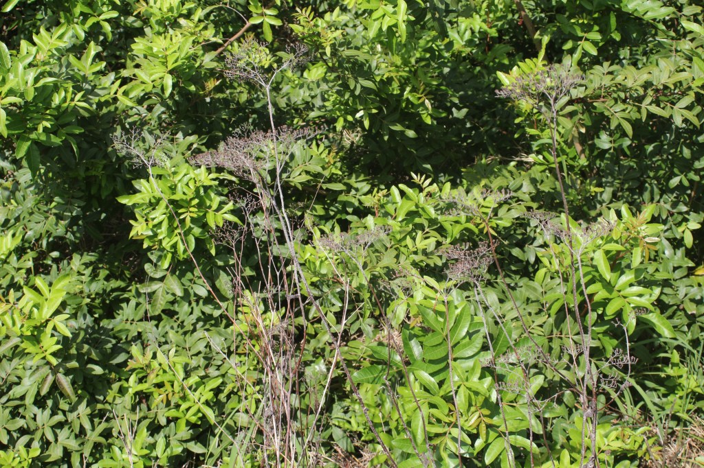 Plant Description: Evergreen shrub or shrubby tree to 3 m. Leaves pinnate, alternate, 9-12 cm long, leaflets 7, oval, entire 1-1.5 cm wide and glabrous. Rachis and young branches reddish. Rachis with narrowly winged margins. Flowers white in a panicle from base of leaf. Fruit reddish.