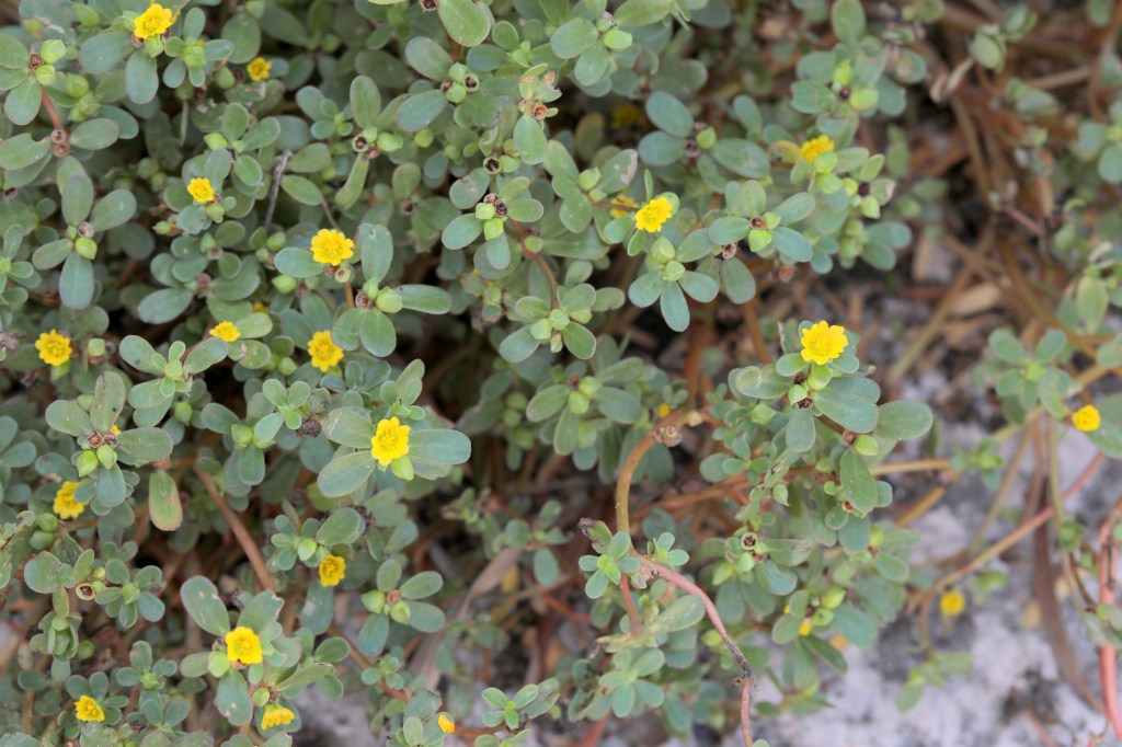 Field Identification: Typical purslane habitat. Thick, pinkish stems. Yellow flowers blooming on the morning. Mat forming.