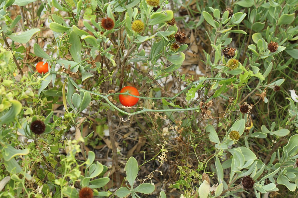 Plant Description: Perennial trailing or climbing vine with tendrils. Leaves 2-8 cm wide, often wider than long, angled to deeply lobed variable but mostly 3-lobes), alternate. Flowers axillary, unisexual, male and females flowers growing on separage plants,the male mostly in clusters; female singly. Corolla 12-25 mm wide, yellow. Fruits 2-5 cm wide, globose, red when ripe but green with pale mottled stripes early.