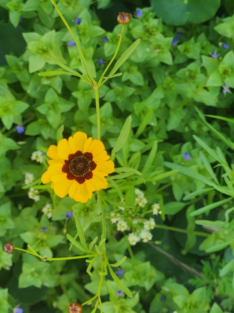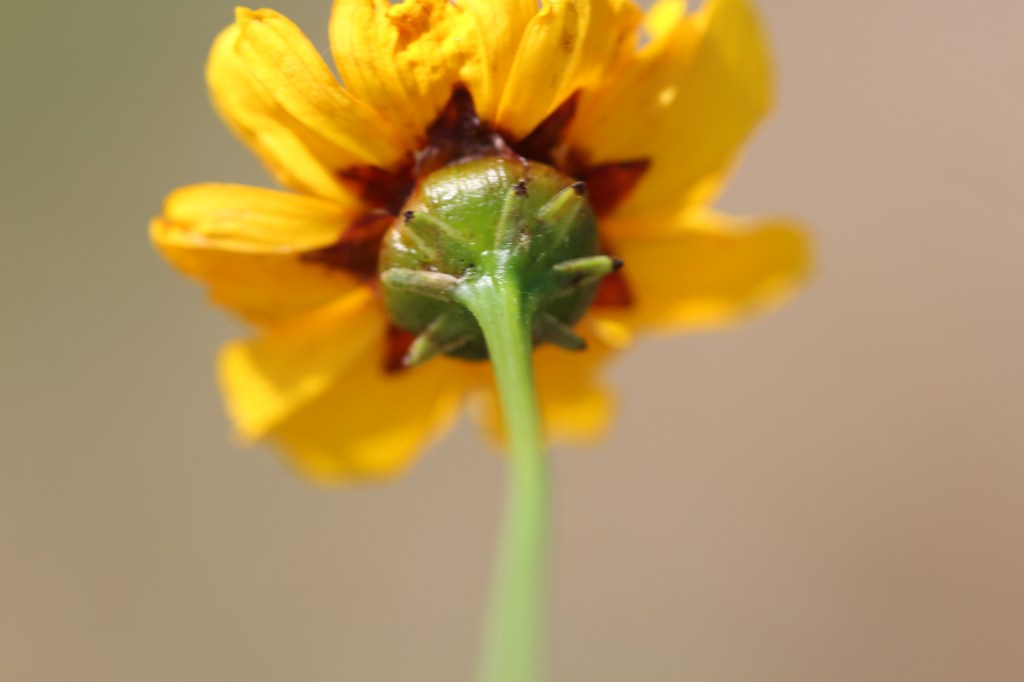 Plant Description: Annual to 50 m high with 1- to 2-pinnately compound leaves, linear to lanceolate, opposite. Heads 2-3 cm wide, solitary. Disks red-brown, rays yellow with purple-brown base. Stems hairless.
