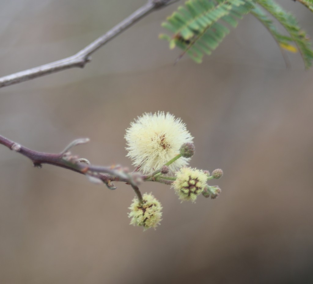 Plant Description: This is a small to medium sized shrub to 10 feet tall with multiple basal stems flaring outward to form a rounded crown. It frequently forms dense, thickets and has small, inconspicuous, slightly recurved to straight thorns. It has narrow delicate and fernlike, bipinnated leaves with 30-50 leaflets per leaf. Flower heads 1-2 cm wide, white to creamy.