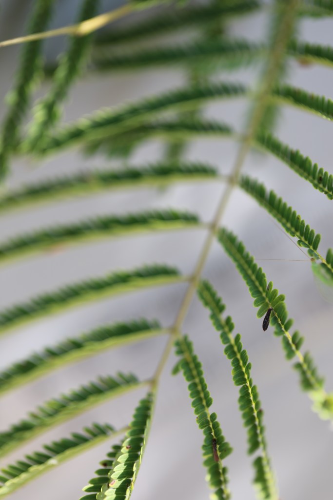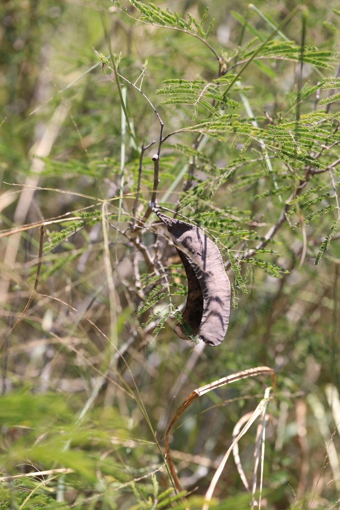 Field Identification: Delicate fern-like bipinnate leaf structure; large, dark seed pod split open and fixed to stem appearing winglike.