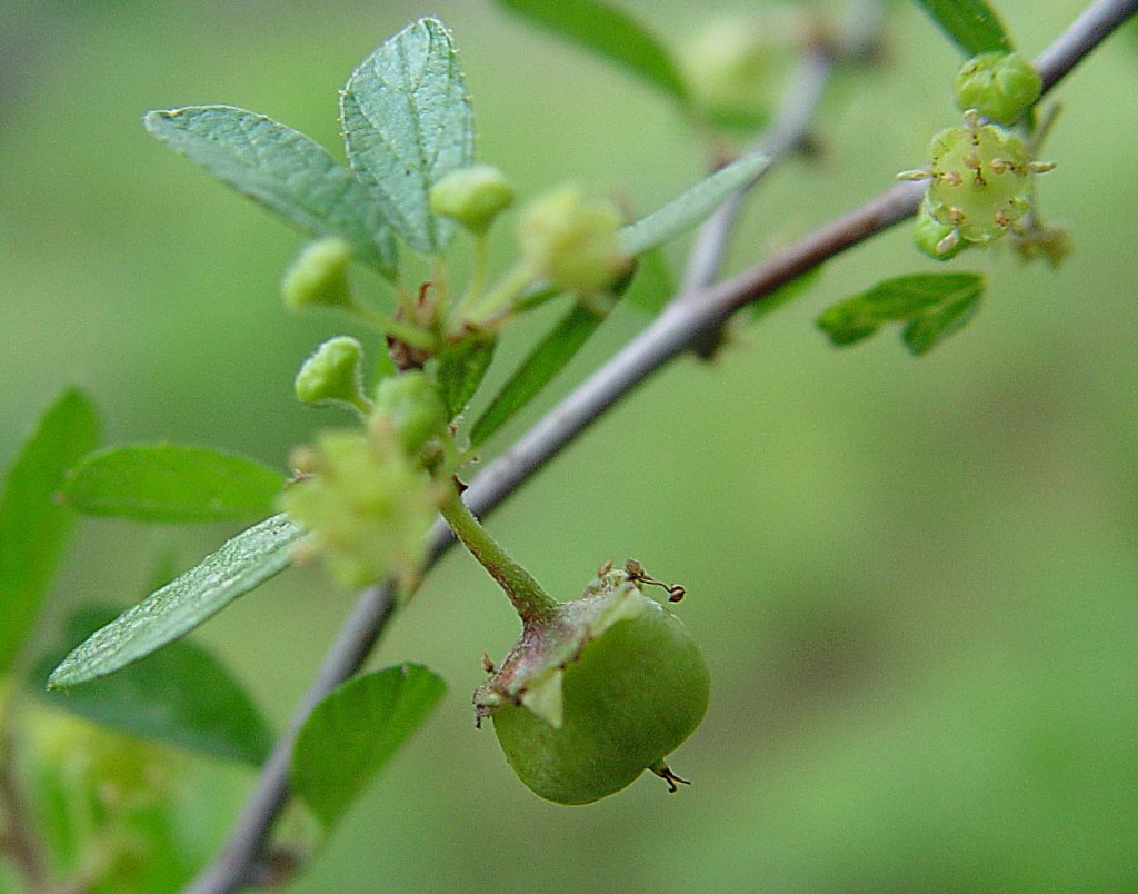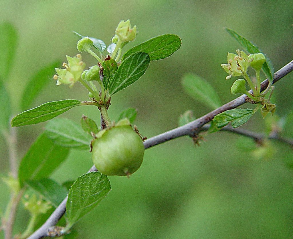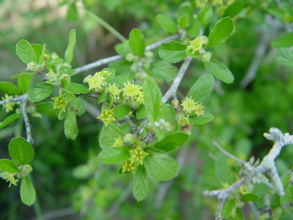 Plant Description: Hairy, deciduous shrub without thorns, to 20 cm or higher with oval to elliptic or oblong leaves 1.5-4 cm long, simple, alternate, margins minutely toothed. Flowers in axillary clusters, the petals about 1.5 mm long, greenish yellow with a well-developed disk. Rounded thicket forming shrub. Fruit dark brown to black and remain on the plant a long time.