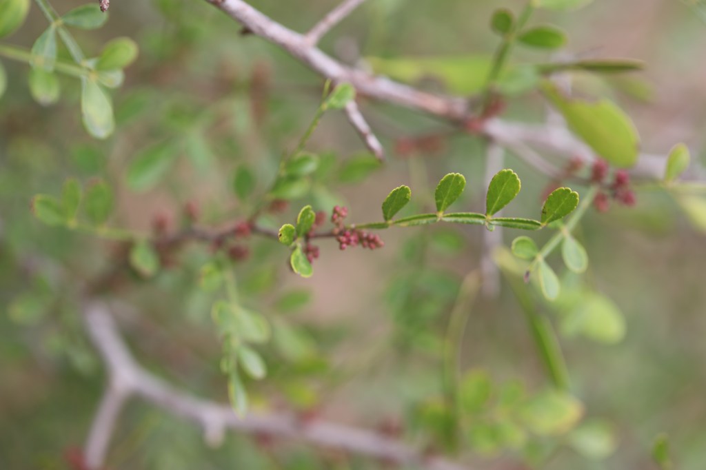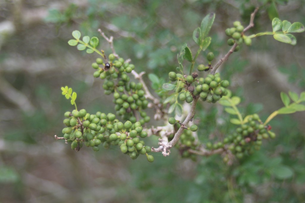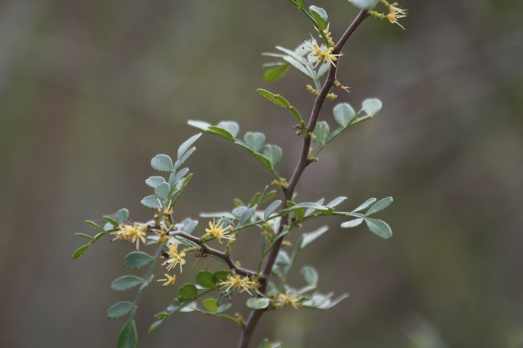 Plant Description: Prickly evergreen shrub to 3.2 m high. Leaves odd pinnate with obovate or oval leaflets 5-20 mm long, 5-13 leaflets per rachis. Rachis and petioles with numerous curved prickles. Crushed leaves aromatic, alternate. Flowers clustered along the branches, both unisexual and bisexual occurring on the same plant. Petals 2-3 mm long, yellow-green.