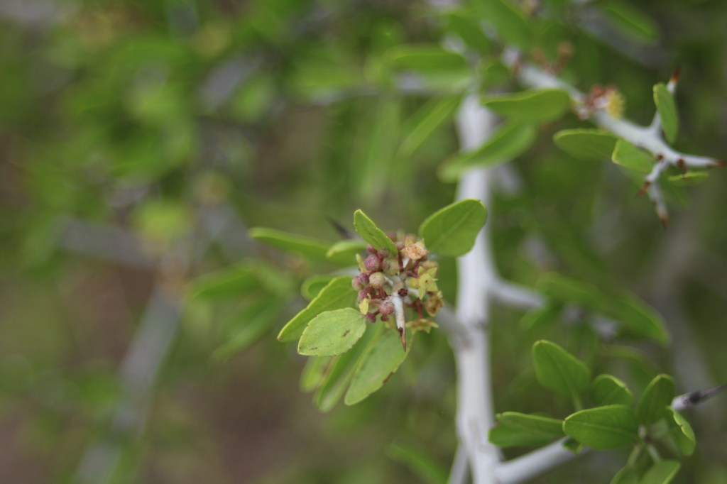 Plant Description: Spine-tipped deciduous shrub to 2.7 m high with a vertical line on young branches. Leaves ovate to ovate-oblong, 1-2.5 cm long, with a grayish cast, alternate. Flowers in axillary clusters, the petals 1-1.5 cm long, greenish yellow. Fruits about 1 cm wide, black.