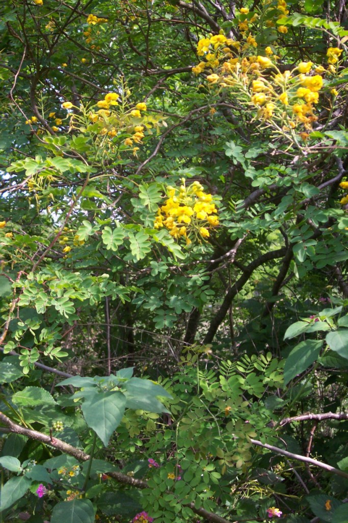Plant Description: Trees with brittle branches, up to 19 feet.; leaflets on each pinna up to 5 pairs, each up to1 inch long. Flowers slightly bilateral, bright yellow, sometimes with red; petals up to1/2 inches long, one of them slightly different. Fruit a legume, brown, up to 2 3/8 inches long.