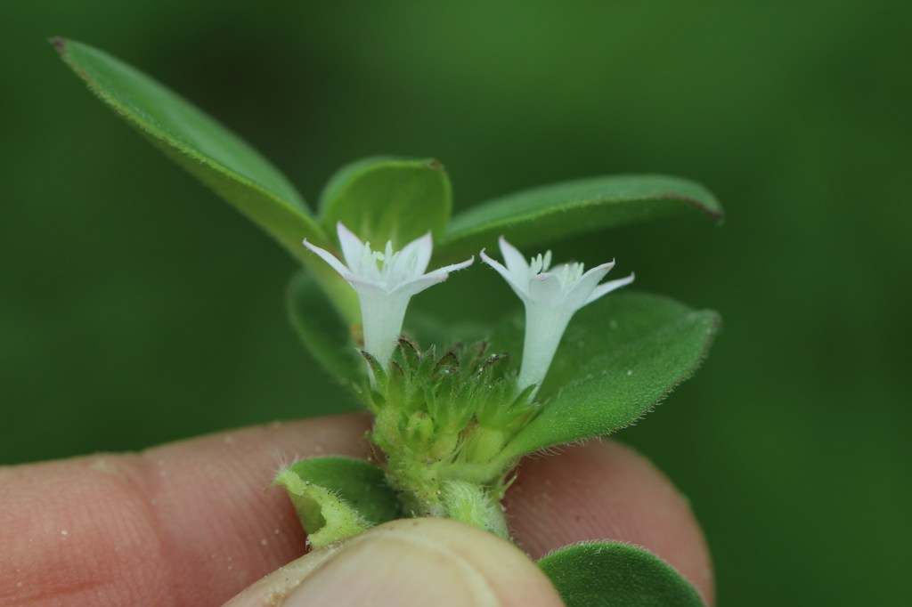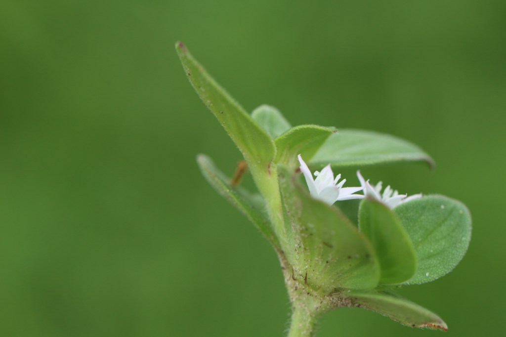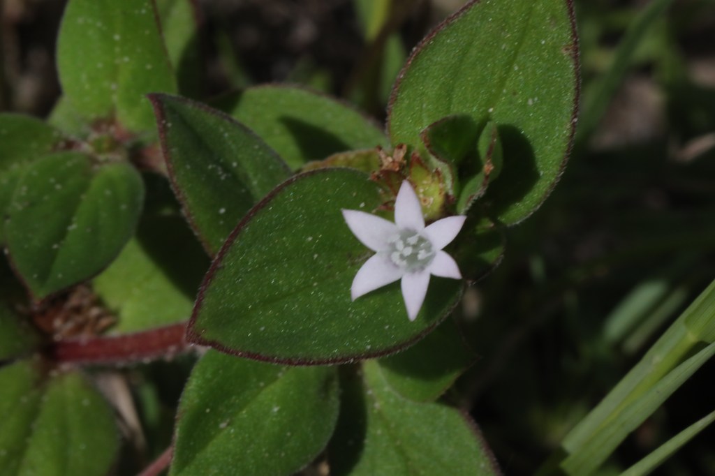 Plant Description: Perennial with usually prostrate stems to 70 cm, forming mats. Leaves 1.5-4 cm long, ovate or elliptic, hairy; often rimmed with brown rim around the leaf. Flowers in compact clusters, the corolla 5-8 mm wide, white.