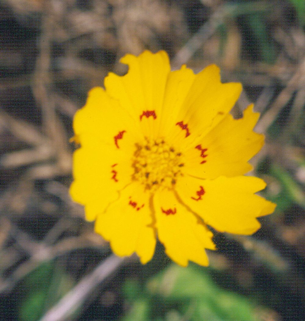Plant Description: Bears the color and basic shape of all coreopsis’. Annual to 40 cm tall with mostly pinnately compound leaves; opposite or basal on lower part of stem; leaves up to 10 cm long , simple leaf, spatulate; leaf margin entire, lobed, Flower heads 3-5 cm wide and solitary, terminal & perfect. Disk yellow or light brown; rays; yellow with an orange zone at base and a variable pattern of brownish red line and dots concentric around face of flower petals appearing as a dashed ring. Glabrous phyllaries. pappus of 2 small scales.