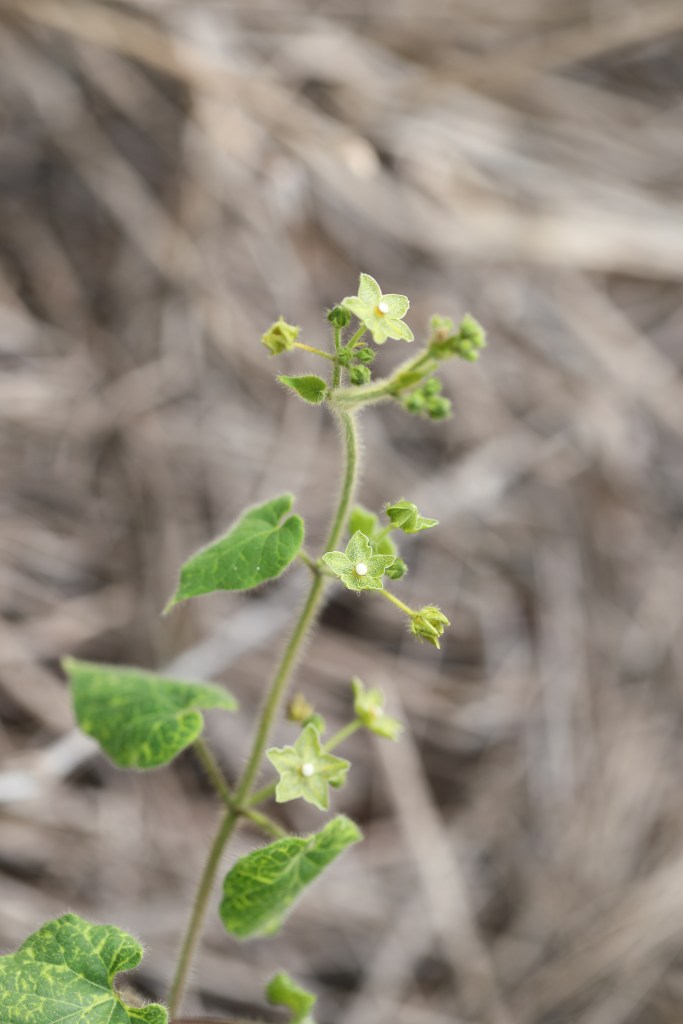 Plant Description: Perennial vine with twining, hairy stems to 5 m or higher. Leaves cordate-ovoid, 5-12 cm long with basal lobes curling inward. Stems with milky sap. Flower in umbel-like cymes, the corolla lobed 4.5-6 mm long, pale green, netted with green-purple. Seeds with long white hairs.