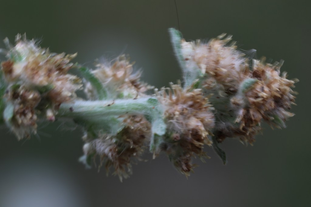 Plant Description: Annual to 30 cm or higher with grayish leaves 2-7 cm long, wooly, alternate, oblanceolate. Heads in spikes or panicles mostly obscured by woolly hairs, 3-4 mm long, in leaf axils, discoid, gray-green or yellowish; ray flowers absent.