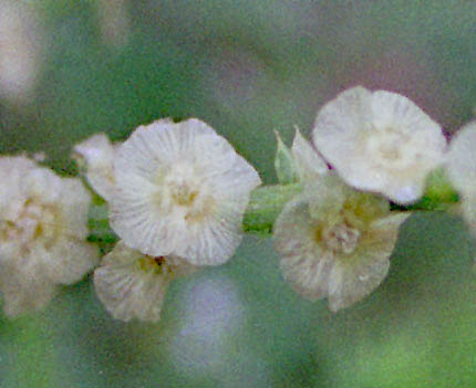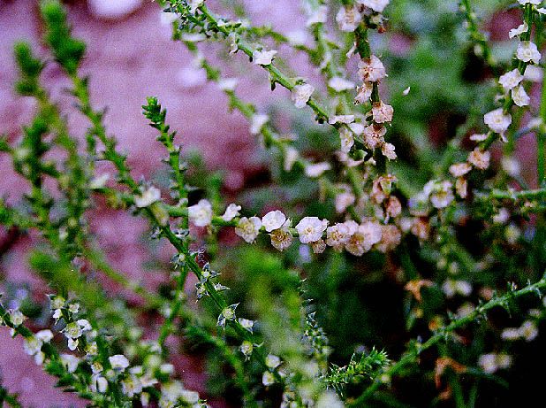 Plant Description: Annual to 1 m or higher, forming clumps; stems greenish with purple stripes. Lower leaves 3-5 cm long, threadlike, the upper shorter, tapered to a short spine, alternate. Flowers solitary, axillary. Fruiting perianth 3-6 mm wide with broadly winged tepals. Fruit are utricles (slightly flattened, one-seeded.