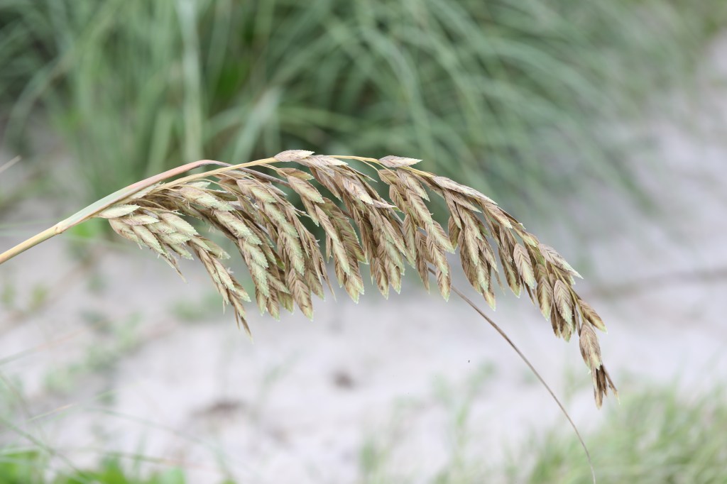 Description: Stout perennial from long, thick rhizomes. Drooping open panicles, open, paniculate flowers and are attached to slender branches. Culms to 2 m tall. Ligules a dense ring of hairs 1-3 mm long. Narrow blade to 8o cm long and 1 cm wide. Panicles contracted. Spikelets strongly flattened. Blooms July-August. Most recognizable grass of beach goers in the state.