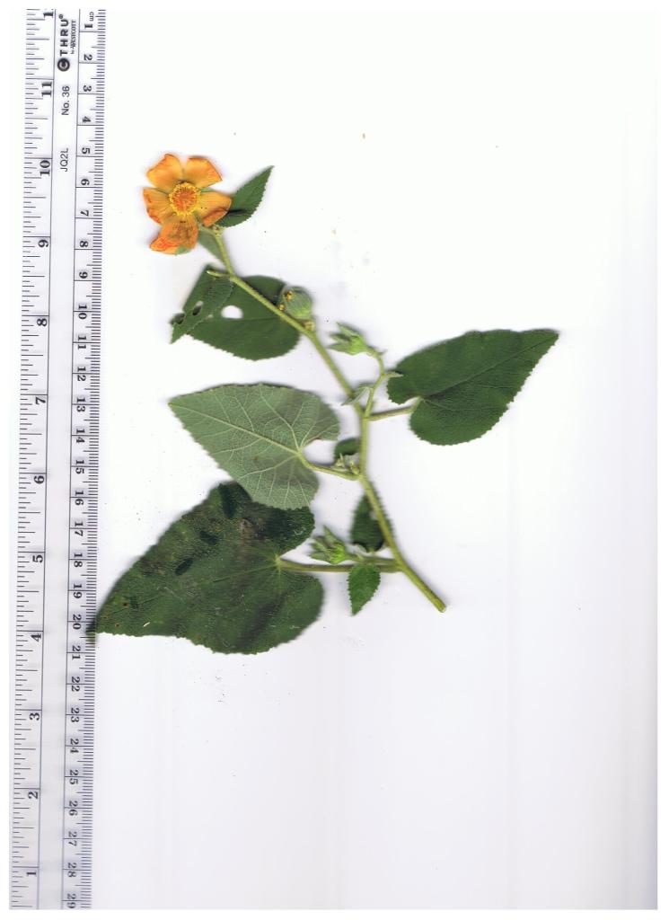 Plant Description: Dense, hairy, perennial or subshrub to 1 m high with ovate to roundish, heart-shaped basal leaves, 3-12 cm long, alternate. Flowers solitary, axillary or in leafy panicles. Petals 11-15 mm long, yellow-orange.