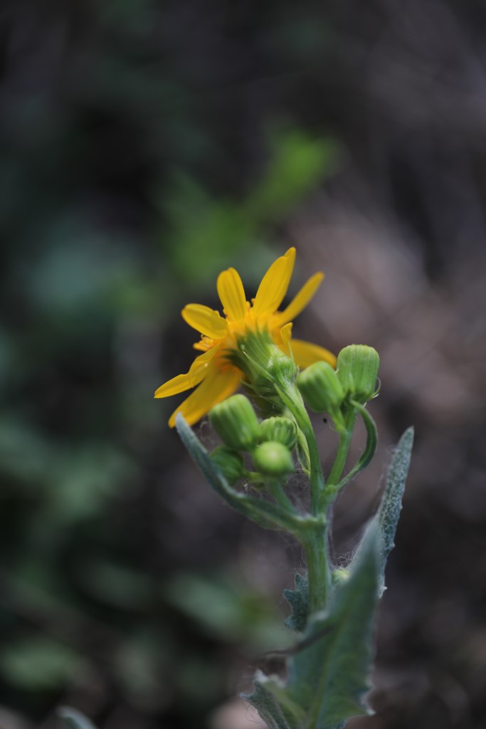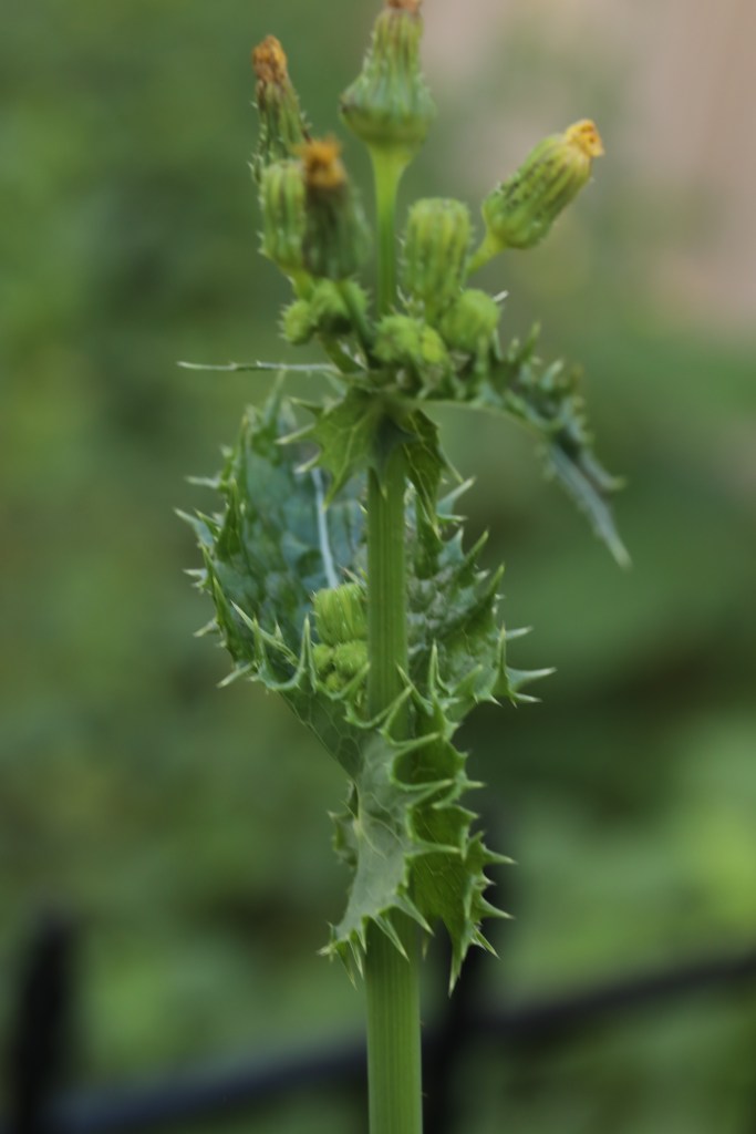 Plant Description: Annual with hollow stems and milky sap, to 120 cm high with spiny-toothed leaves 7-20 cm long, alternate. Petioles with a pair of pointed basal “ears,” margins lobed and sharp-toothed. All flowers look like ray flowers, yellow, but with five lobes. Heads corymbose clustered, 1.5-2.8 cm wide, ligulae.