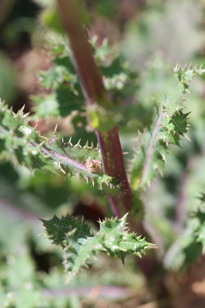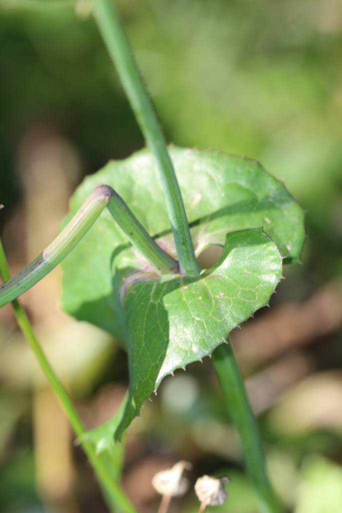Field Identification: the two sow thistle species are distinguished by their achenes (seed). Petioles base pairs on S. asper are more or less rounded, where as those of S. oleraceus are pointed.