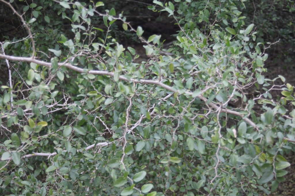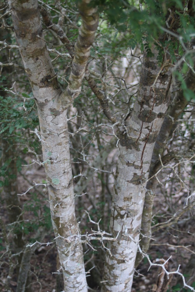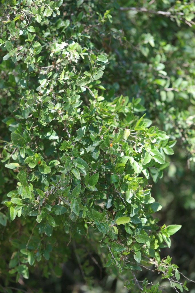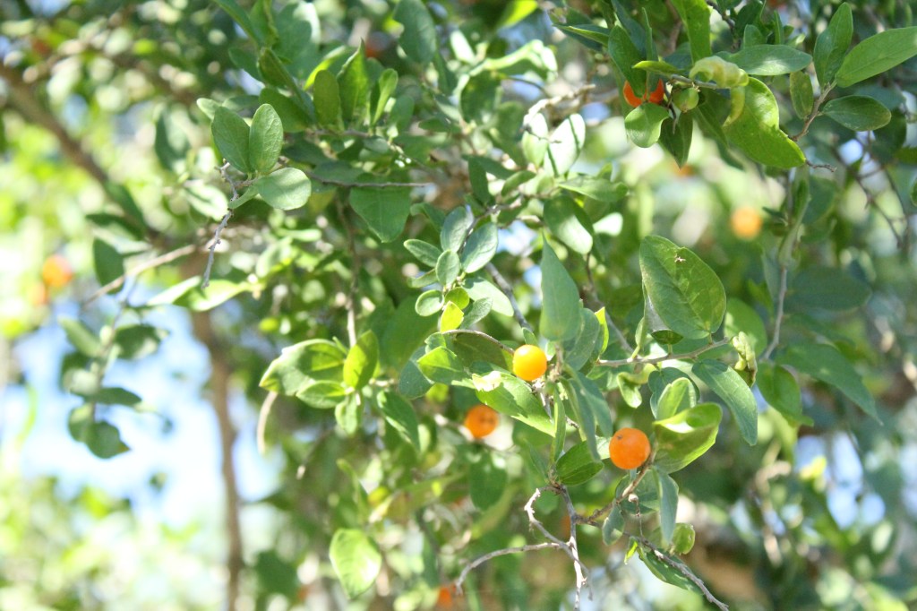 Plant Description: A medium sized evergreen shrub with strongly zigzagged smooth, gray branches and stout, paired thorns. The simple, alternate, green leaves are oblong with tooted margins. It has inconspicuous, greenish white axillary flowers and small round orange berries.