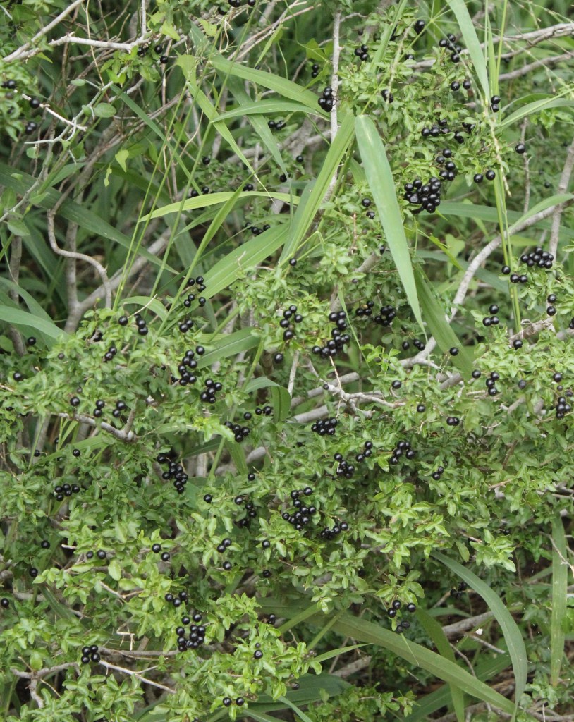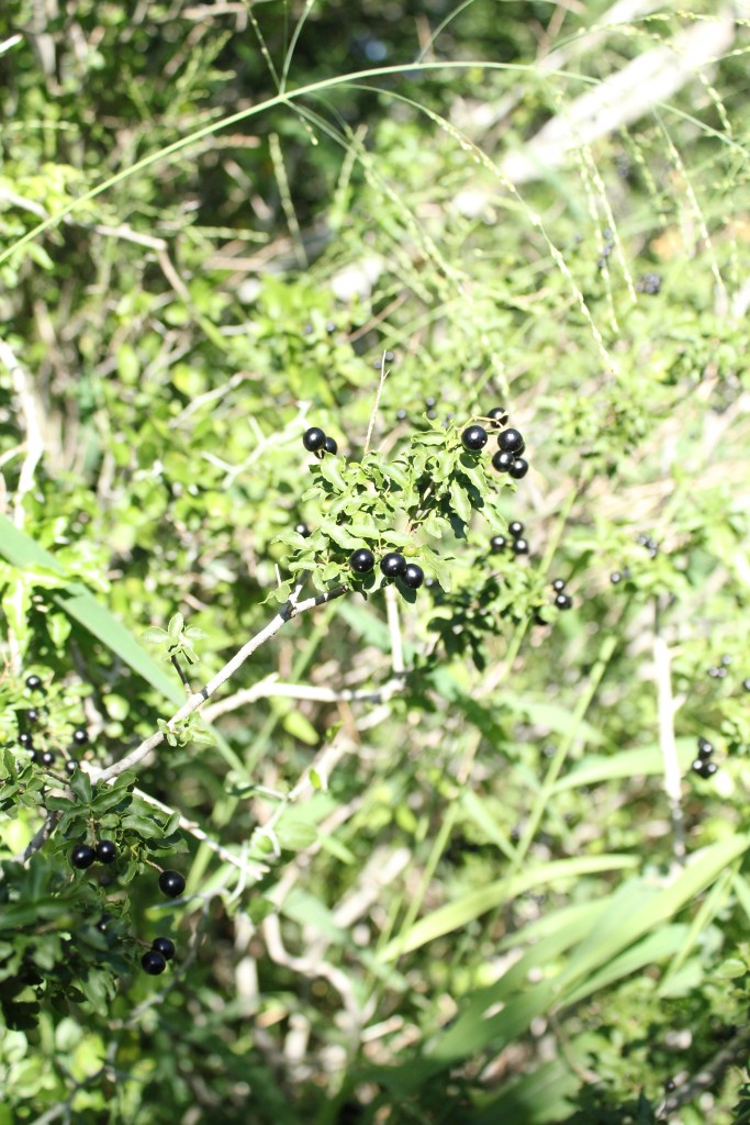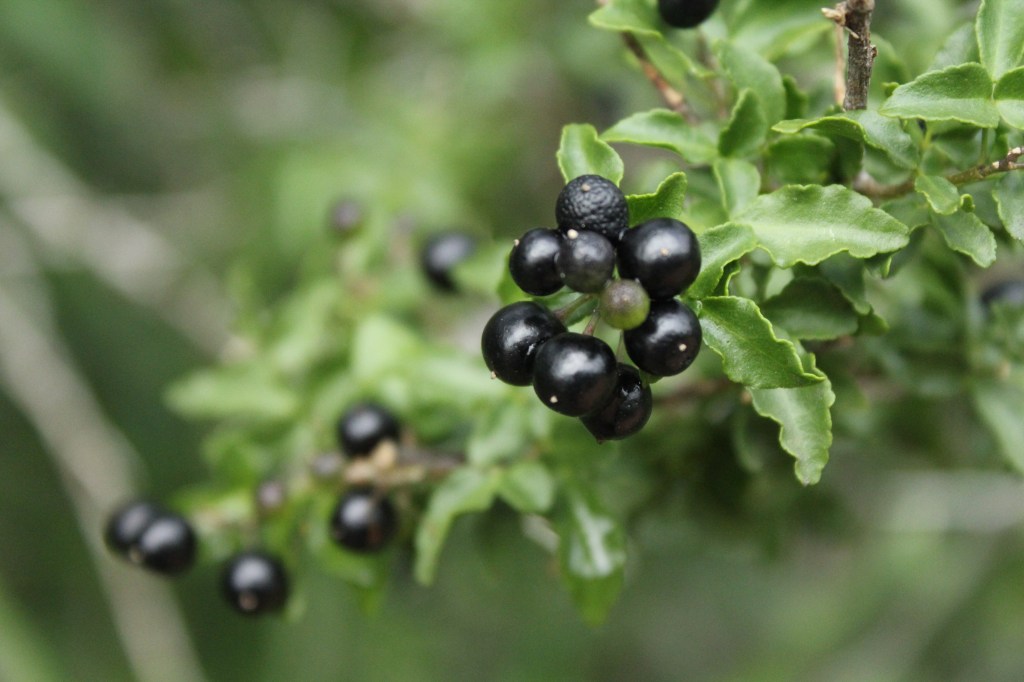 Plant Description: Thornless evergreen shrub to 1.7 m high with 3-foliate leaves, the leaves 6-30 mm long, ovate to oblong with wavy edges, alternate. Aromatic leaves when crushed. Flowers in panicles. Petals 2-3 mm long, white. Fruits black.