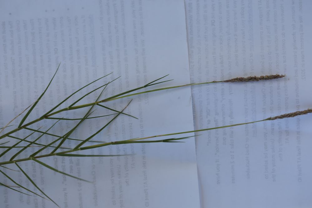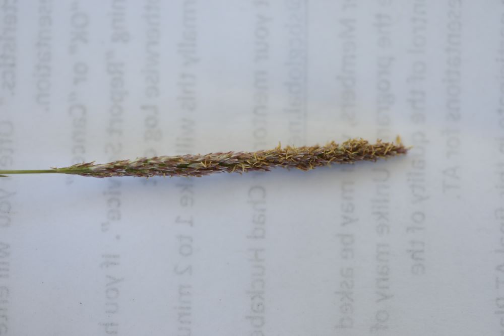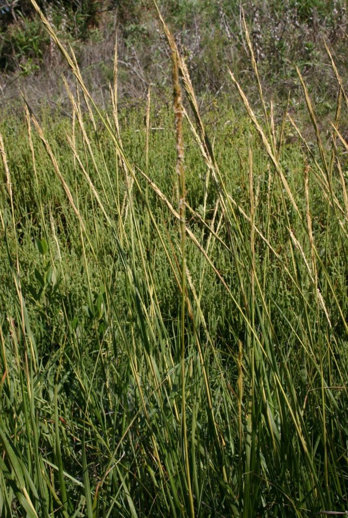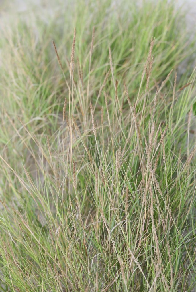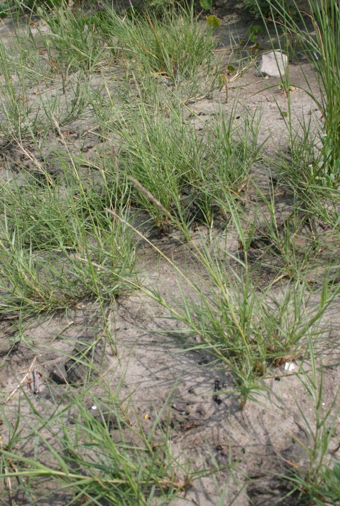 Description: Erect to decumbent perennial to 38 cm tall with creeping rhizomes and stoloniferous. Firm closely crowed leaves (2-ranked) have conspicuously overlapping sheaths and short blades. Panicles 2-30 cm long and contracted. Fruit is free from the lemma and palea and will fall from the mature spikelet, resulting its common name. Bloons Summer-Fall.