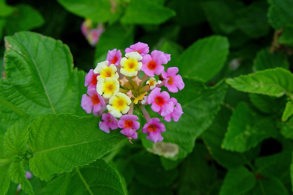 Plant Description: Shrub to 1.5 m tall, often with stiff hairs. Leaves opposite, ovate, 5 cm or longer, the margins finely toothed. Flowers in heads up to 5 m broad. Corollas slightly bilateral, mostly opening yellow, then turning pink. Fruit roundish, drupes, turning black when mature.