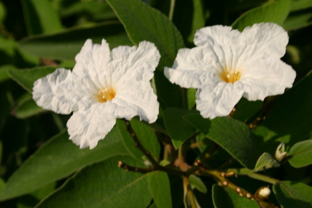 Plant Description: Stout, short trunked, thick branched subtropical evergreen shrub or small tree to 4 m, rounded crown and thick, gray, ridged bark. Thick ovate to lanceolate leaves covered with a dense pubescence, velvety on top with a hairy, brown underside. Funnelform flowers white with yellow throat, tissue-like 35-45 mm long. Fruit, a drupe, 3-3 cm long, ovoid, aging to reddish brown.
