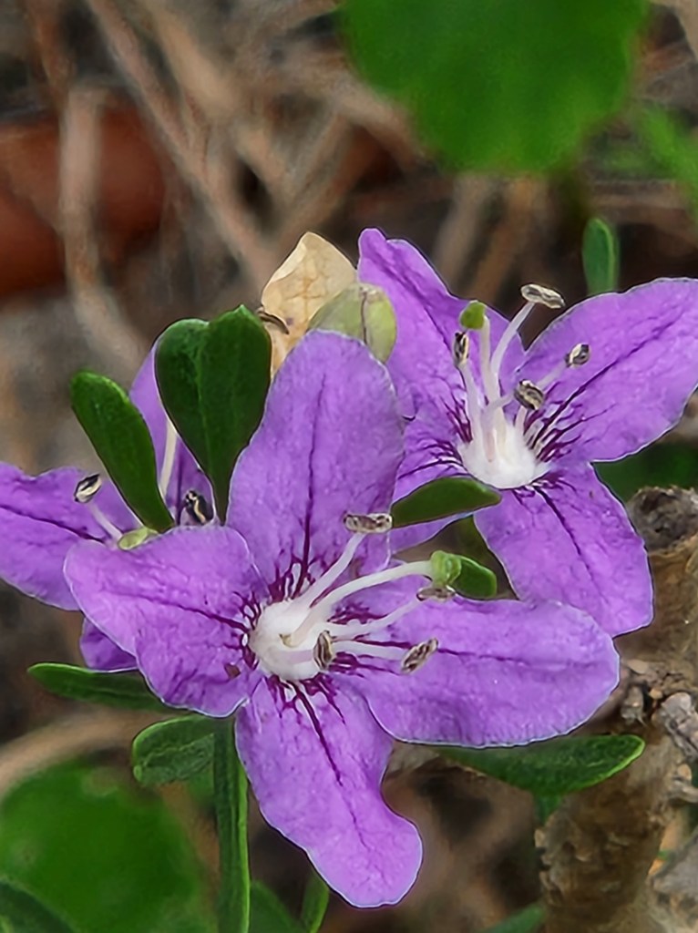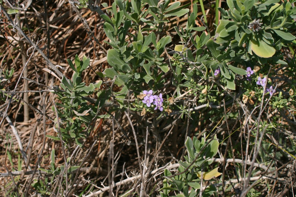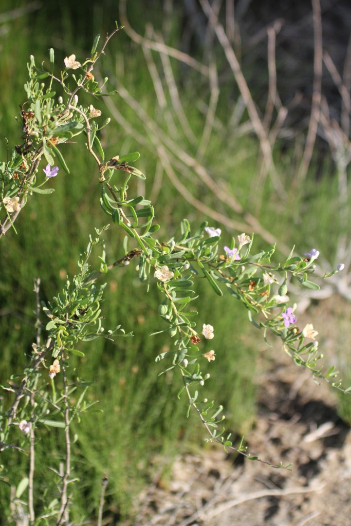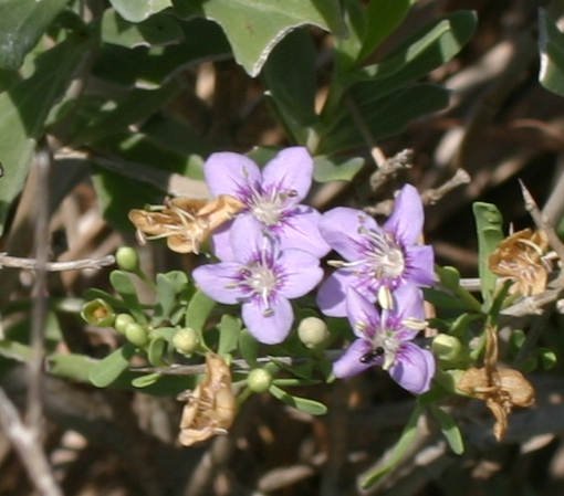 Plant Description: Spiny semi-evergreen shrub to 1 m or higher with upright to spreading stems. Leaves 1-5 cm long, linear, spatulate, alternate thick and succulent. Flowers radial, axillary, the corolla 1.5-2.5 cm wide, blue-violet or lavender, four lobed. Fruits red.